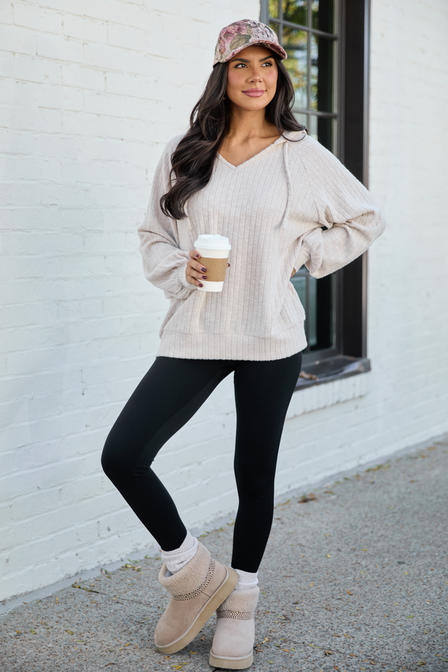 Baylor Beige Balloon Sleeve Ribbed Hoodie