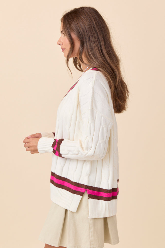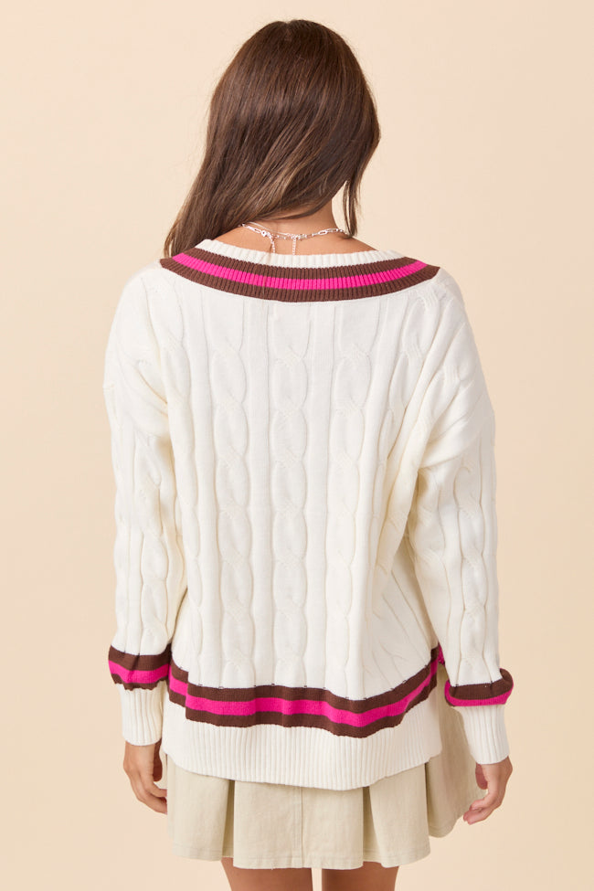 Paris Pink And Brown Varsity Stripe Cable Knit V-neck Pullover FINAL SALE