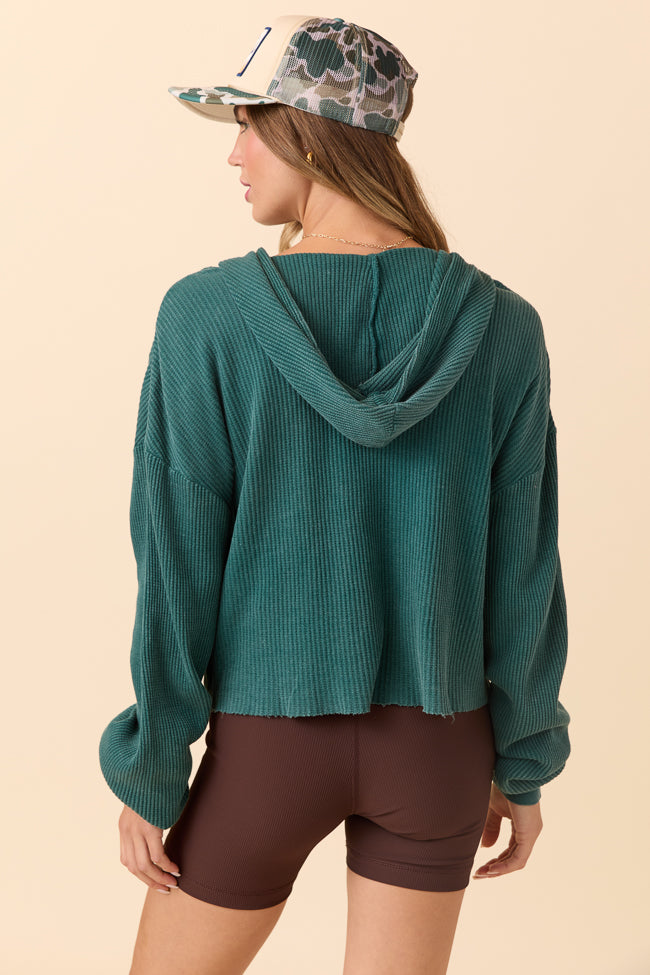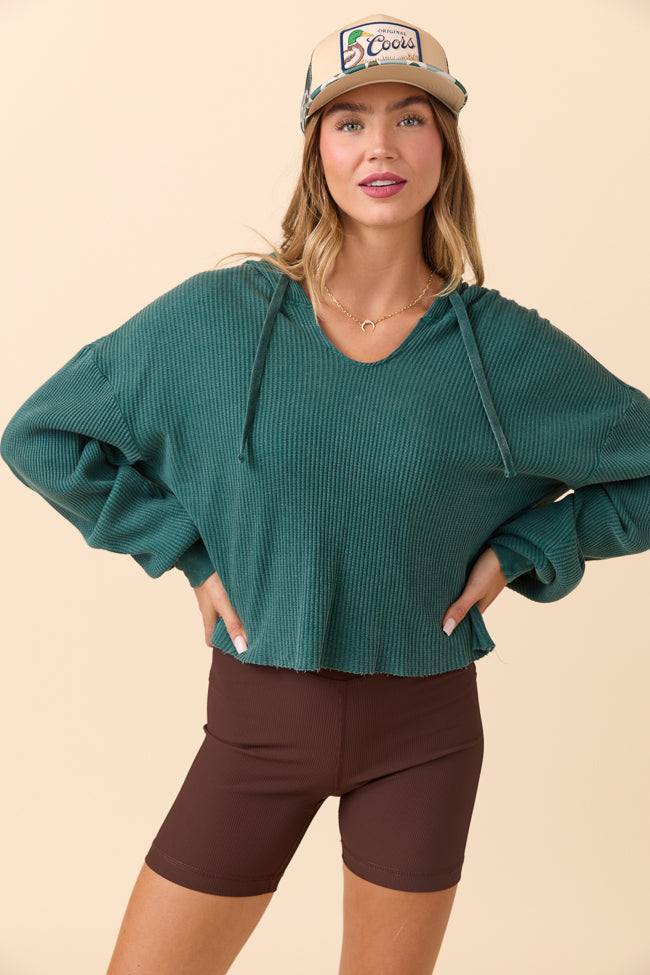 Marnie Deep Green Long Sleeve Mineral Wash Thermal Hoodie