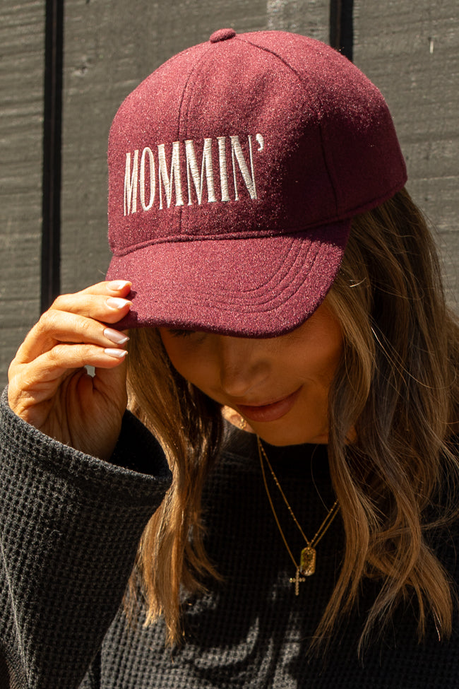 • Burgundy felt baseball cap with an embroidered mommin’ design